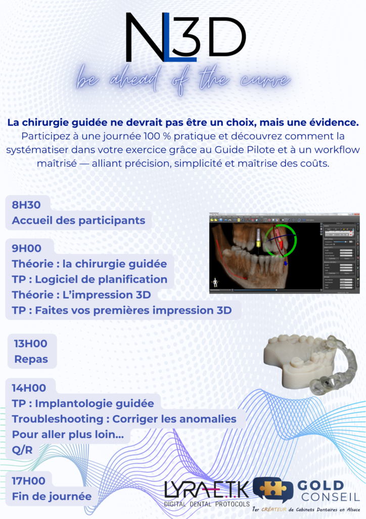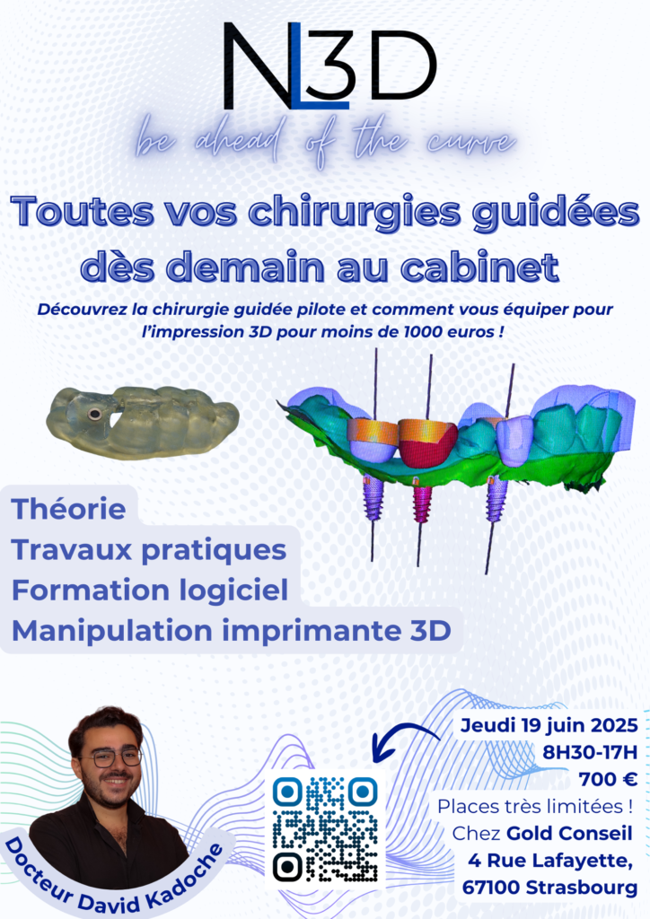 Le jeudi 19 juin 2025, nous vous accueillons à Strasbourg pour une journée complète dédiée à la chirurgie guidée et à l’impression 3D, avec une approche centrée sur la pratique, la rigueur clinique et la simplicité des outils.